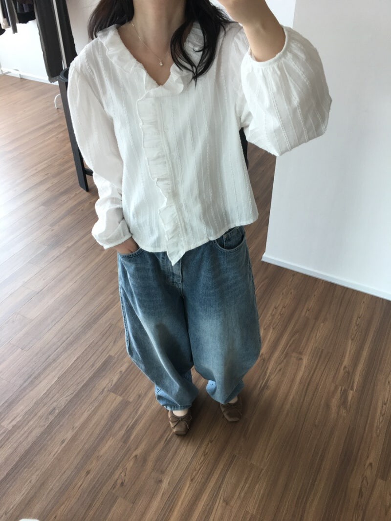 샵에누의 첫 번째 마켓 때 많은 사랑을 받았던 tana. 피치 원단이라 착용감이 편안하고, 적당한 파임이 넥라인을 예쁘게 만들어준답니다. 블라우스를 좋아하지 않는 주인장도 일주일에 두세 번씩 잘 입고 있어요.